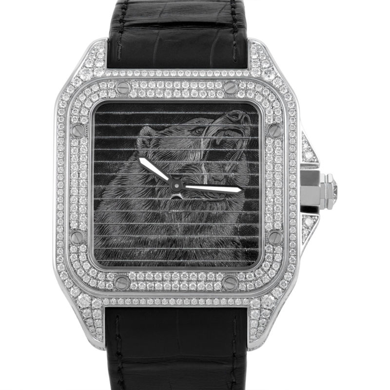 159995.00 Price:159995.00Watches Jewelry Accessories About us Policies Cartier Santos 100 Mens Manually Wound Automatic Watch 3229A (Click to Enlarge) Cartier Santos 100 Mens Manually Wound Automatic Watch 3229A Condition: Certified Pre-Owned Brand: Certified Pre-Owned Retail Price: $350,000.00 Reference: 3229A Also Known As: 3229A Web ID: 166776Stock Number: 2188812-MCase Size: 42 mm Gender: Gents Movement: Manual Wind Caliber: 9601 MC Bezel: 18K White Gold and Diamonds Functions: Hours, Minutes Strap: Leather Clasp Type: Deployment Signatures: Cartier Included Items: Manufacturer's Box and Papers Materials: 18K White Gold Finishing: 18K White Gold Case Back: Transparent (See-Through) Dial Color: Diamond Pave Offering three extremely diverse looks interchangeable through swift turns, this amazing timepiece from Cartier is an accurate and reliable wristwatch limited to 50 pieces and adorned with resplendent diamonds for a mesmerizing prestigious effect. Hours and minutes are shown via central luminescent hands upon the extraordinary dial which switches from a clear silver backdrop with Roman numerals to a majestic depiction of a roaring bear and finally a dazzling checkered pattern of black sapphires and lustrous diamonds. Also set with glistening diamonds and mounted onto a black leather strap with folding clasp, the 18K white gold case features transparent back through which the hand-wound 9601 MC caliber can be seen.Please note that some watches are on memo from other dealers and do not carry a return policy, you will be notified before your purchase if the selected watch meets this criteria. (Click to Enlarge) (Click to Enlarge) (Click to Enlarge) (Click to Enlarge) (Click to Enlarge) Domestic Buyers - Please Note:• Luxury Bazaar ships all items "signature required." We do not accept requests to redirect and/or hold, or pick up at FedEx locations. International Buyers - Please Note:• Import duties, taxes and charges are not included in the item price or shipping charges. These charges are the buyer's responsibility. Please check with your country's customs office to determine what these additional costs will be prior to bidding/buying.• These charges are normally collected by the delivering freight (shipping) company or when you pick the item up – do not confuse them for additional shipping charges.• We prescribe to a "No Questions Asked" return policy for all in stock items. This does not apply to items that are on memo, or special and/or custom orders. If for any reason whatsoever you are not 100% satisfied with your purchase, send it back and we will refund your order. The only fees you will be responsible for are return shipping costs, and for international customers, any duties or value added taxes.• We do not mark merchandise values below value or mark items as "gifts" - US and International government regulations prohibit such behavior. Price Points Under 500 500 to 1K 1K to 2K 2K to 5K 5K to 20K 20K to 50K 50K to 100K 100K to 300K 300K Plus Categories Watches Jewelry Accessories About us Welcome to Luxury Bazaar, a place where nothing is ordinary™. We are the ultimate online portal for luxurious, high-end watches, jewelry, and accessories with a specialization in high-end time pieces. We have some of the finest brands on the market, and we pride ourselves in our ability to deliver the most excellent and rare pieces with competitive pricing which others cannot offer. Here at Luxury Bazaar we believe that what we are doing is extraordinary. We feel that listing high-end pieces is easy enough, but to sell these products is another story altogether. Since our founding, we have been building trust with new and existing customers by ensuring that transactions with us go through smoothly, discreetly, and completely to the customer’s satisfaction. Affiliations