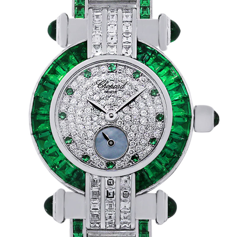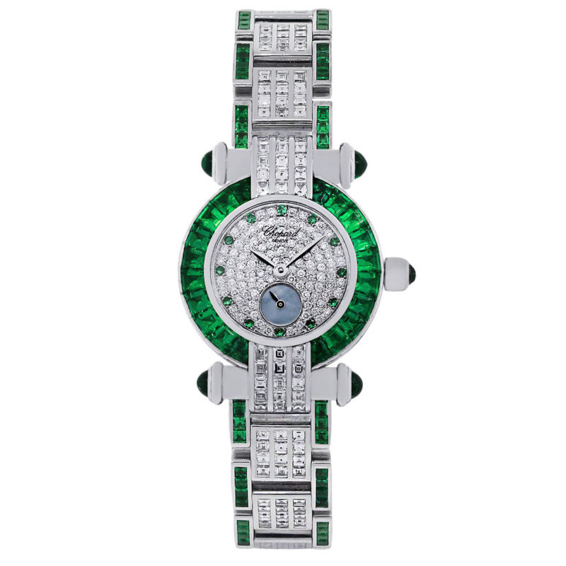180000.00 Price:180000.00PALMS PLAZA22191 Powerline Road #12bBoca Raton, FL 33433Phone: 561-750-7808Fax: 561-750-8005Toll-Free: 1-800-329-4367Store Hours - Mon-Fri: 10-6 Sat: 9-5 Sun: Closed Brand ChopardStyle Imperiale MPN 393234-22 Serial 415378 Case Material18k white gold Case Diameter26mm Bezel 18k white gold emerald gemstone bezel Dial Round brilliant diamond dial with emerald gemstone hour markers. Sub dial at 6 o' clock Bracelet18k white gold diamond emerald bracelet CrystalScratch resistant sapphireSize Will fit a 6" wristClaspDouble fold over clasp MovementAutomatic Additional Details This item comes with original Chopard box and papers and 1 year warranty!SKU A30310744 Thank you, Raymond Lee Jewelers Return Policy: - Returns accepted within 14 days if item is not as represented or customer is unhappy; buyer has to pay for return shipping costs and insurance. Item must be returned in same condition as received. Florida buyers must pay a 6% sales tax