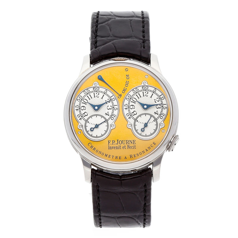 58830.10 Price:58830.10Govberg Jewelers - Since 1922 Authorized dealer of the finest timepieces. Visit Our eBay Storefront F.P. Journe Chronometre a Resonance Manual 38mm Platinum Mens Strap Watch Govberg's Price: $74,500.00 Pre-Owned F.P. Journe Chronometre a Resonance manual-wind watch, features a 38mm platinum case surrounding a gold dial on a black alligator strap with a platinum tang buckle. Functions include hours, minutes, small-seconds, dual-time and power reserve indicator. This watch comes complete with box and papers. We back this watch with a 15-month warranty! Watch this Item Send to Friend Style Dress Case Size 38mm Buckle Type Tang Buckle Country/Region of Manufacture Switzerland Hour Markers Arabic Numerals Movement Mechanical (Hand-winding) Band Material Alligator Brand F.P. Journe Case Material Platinum Band Color Black Age Group Adult Case Color Silver Caseback Exhibition Gender Men's UPC Does not apply Year of Manufacture 2000 - 2009 Water Resistance Rating 30 m (3 ATM) Model Chronometre Resonance Face Color Gold Display Analog Warranty 15-Month Govberg Jewelers Warranty Features Dual time zone,Power Reserve Indicator MPN Chronometre Resonance Box/Papers Box and Papers Watch Shape Round Increase your Sales Abroad with WebInterpret's Global Listing Solution.
