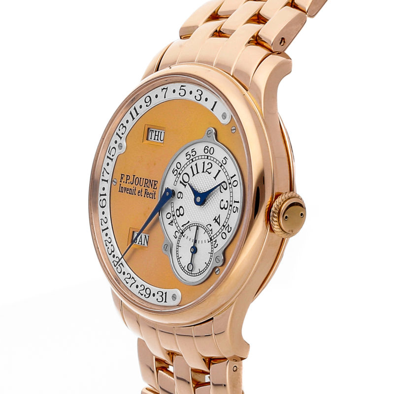 58876.09 Price:58876.09Govberg Jewelers - Since 1922 Authorized dealer of the finest timepieces. Visit Our eBay Storefront F.P. Journe Octa Calendrier Watch Govberg's Price: $74,500.00 Pre-Owned F.P. Journe Octa Calendrier self-winding automatic watch, features a 38mm 18k rose gold case surrounding a rose gold dial on an 18k rose gold bracelet with folding buckle. Functions include hours, minutes, small-seconds, day, date and month. This watch comes complete with box and papers. We back this watch with a 15-month warranty! Watch this Item Send to Friend Style Dress,Statement Case Size 38mm Buckle Type Folding Buckle Country/Region of Manufacture Switzerland Hour Markers Arabic Numerals Movement Mechanical (Automatic) Band Material Rose Gold Brand F.P. Journe Case Material Rose Gold Band Color Rose Gold Age Group Adult Case Color Rose Gold Caseback Exhibition Gender Men's UPC Does not apply Year of Manufacture 2000 - 2009 Water Resistance Rating 30 m (3 ATM) Model Octa Face Color Gold,Rose Display Analog Warranty 15-Month Govberg Jewelers Warranty Features Day and Date,Month Indicator MPN Calendrier Box/Papers Box and Papers Watch Shape Round Increase your Sales Abroad with WebInterpret's Global Listing Solution.