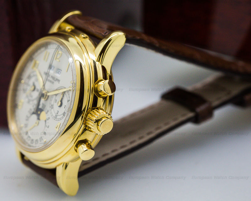 198000.00 Price:198000.00in titles & description Home About Us Payment Shipping Returns New Arrivals Contact Us OUR BRANDS Patek Philippe Perpetual Calendar Split Second Chronograph 5004 18K Yellow Gold (5004J-012) Description Patek Philippe 5004 Perpetual Calendar Split Second Chronograph, 5004J-012 5004J, 18k yellow gold case is extremely thick and appears to be unpolished, all 4 hallmarks are deep and intact and clearly visible without magnification, the case is also starting to develop a charming tarnish, manual wind Patek Philippe 27-70Q movement with the Geneva seal, 60 hour power reserve, gorgeous and perfectly balanced silver dial with applied yellow gold Arabic numerals, perpetual calendar function (English) with day, date, moon phase and leap year indicators, gold leaf hands, size 37mm, thickness 15mm. This example is in top collector condition and is complete with the original box, solid case back, setting pin, archive certificate and original certificate dated 1 / 2005. This is an 18K yellow gold Patek Philippe Perpetual Calendar Split Second Chronograph, 5004J-012. It has a crocodile leather strap with an 18k yellow go ld tang buckle. It has an exhibition screwed-down sapphire display case back, a case band with 4 correctors, Pump style chronograph pushers, and a co-axial pushbutton in the crown for the split-seconds function. It also includes an interchangeable solid case back. The case is extremely thick and unpolished, and all 4 hallmarks are deep and intact and clearly legible. The 37mm diameter solid three-body case, fluted lugs, and angled bezel are polished/brushed. The dial is silver with applied yellow gold Arabic numeral hour markers and yellow gold feuille hands. There is a 1/5 second/minute outer track, and the perpetual calendar is in English. The day and month aperture windows are at the 12 o'clock position, and there is a 30-minute chronograph totalizer with a leap-year cycle at 3 o'clock. There is a moon phase sub dial at 6 o'clock, and a small seconds stub dial with 24-hour time at 9 o'clock. Its water resistant to 30 meters/100 feet, and it has a 60-hour po wer reserve at full wind. The 15mm thick case, dial, and movement are all signed. It is stamped with both the Geneva quality seal and the Patek Philippe seal. The mechanical manual winding Patek Philippe caliber 27-70Q movement is rhodium plated, with fausses cotes embellishment. It's constructed with 28 jewels, 10 bridges, and 407 components. It has a Glucydor Gyromax balance that's adjusted for temperature and 5 positions, a self-compensating Breguet balance spring, and a shock absorber mechanism. It oscillates at a frequency of 18,000 vph (3 Hz). The Patek Philippe Perpetual Calendar Split Second Chronograph, 5004J-012, was introduced in 1996. Payment Shipping Returns Feedback Contact Us PayPal, Major Credit Cards (phone verification required) Free USA FedEx Overnight Shipping and Insurance included. $50 USD flat rate FedEx International Priority Shipping. Please allow 1-2 day processing. 2-day full money back guarantee. (2 days from receiving the watch, also applies internationally) Payment PayPal, Major Credit Cards (phone verification required) Shipping Free USA FedEx Overnight Shipping and Insurance included. $50 USD flat rate FedEx International Priority Shipping. Please allow 1-2 day processing. Returns 2-day full money back guarantee. (2 days from receiving the watch, also applies internationally) Feedback Contact Us