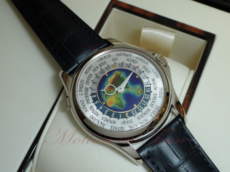 139995.00 Price:139995.00Motion in Time, Inc. Super Exclusive & Extremely Rare Crème de la Crème Patek Philippe 5131G-001 Email Cloisonné World Timer Special Edition in 18kt White Gold Extremely Rare & Super Collectible Special Production * * You WILL NOT See Many of These Around! * * EXCLUSIVE MANUFACTURED TIMEPIECES An unprecedented combination of complexity and simplicity. Reference No. 5131G-001 BUY IT NOW FOR $139,995 Watch Description Exotic - Rare - And Absolutely Breathtaking! Super Exclusive World Time from Patek Philippe. A powerful & striking watch - will definitely draw attention & makes for a great conversation piece. The Patek World Time is an iconic piece. We are happy to offer one of the rarest Patek "Email Cloisonné" World Timers ever made in 18kt White Gold. Patek Philippe 5131G "Savoir-Faire" World Time Complicated Watch 18kt White Gold, "Email Cloisonné" Enamel Painting Depicting Africa, Europe, Asia and Australia, Patek Philippe Caliber 240 HU Self-Winding Movement with World Time 24-Hour and Day/Night Indication for the 24 Time Zones, Approximately 48 Hours of Power Reserve, Crocodile Alligator Strap with Square Scales, 18kt Rose Gold Fold-Over Deployant Buckle, Skeleton Back, 39.5mm Patek Philippe introduced the world time complication, also known as a “worldtimer”. The early versions of these Patek Philippe world time watches generate seven figure auction results. In more recent years, Patek has offered a few variations. This reference 5131 is by far the most beautiful world time offering from Patek. The dial displays the world map made using the art of cloisonné. Cloisonne watch dials are the efflorescence of the watch dial artisan craft. The process of making each dial is painstakingly manual and involves hundreds of individual steps. Truly, the dial on this watch is art. The 5131G in 18k white gold is the rarest, by far, of the modern world time production. The way a true worldtimer like this watch works, is the two-color silver and blue (representing daytime and nighttime) ring with ‘1’ through ‘23’ and the sun at 12 o’clock noon and the moon at midnight, makes one revolution in 24 hours. There are 24 reference cities at the outer edge of the dial, one city representing each of the world’s timezones. The hour in that city is shown on the 24 hour ring which turns counter-clockwise. It’s an ingenious way of displaying the time all over the world instead of the much more limited “GMT” approach. The case is 18k white gold and measures 39.5mm diameter by 10.5mm thick. The front and display back crystals are sapphire. Movement is the automatic winding Patek Philipe Caliber 240 HU with 33 jewels, 22k mini-rotor, 239 individual parts and power reserve of 48 hours. Strap is Patek Philippe crocodile with 18k white gold Patek Philippe deployant clasp. Reference 5131 is the successor of reference 5130 and shows three notable differences: use of a distinguishable cloissonné enamel dial, the names of the 24 cities are displayed in Italic type, and the signature Patek Philippe and company location Genève are engraved on the bezel. Only two or three enamellists are able to produce these rare dials for Patek Philippe. Reference 5131 is equipped with the ultra-thin automatic caliber 240 HU (HU for "Heure Universelle". It features a 22k gold micro-rotor recessed in the back plate. A modern world time wristwatch, the mechanism dates back to the 1930s when talented Geneva watchmaker Louis Cottier devised it and offered his invention to Patek Philippe. Cottier's ingenuity resulted in the company's now classic references 1415 HU, 605 HU, and 2523 HU. The way a true worldtimer like this watch works, is the two-color silver and blue (representing daytime and nighttime) ring with ‘1’ through ‘23’ and the sun at 12 o’clock noon and the moon at midnight, makes one revolution in 24 hours. There are 24 reference cities at the outer edge of the dial, one city representing each of the world’s timezones. The hour in that city is shown on the 24-hour ring which turns counter-clockwise. It’s an ingenious way of displaying the time all over the world instead of the much more limited “GMT” approach. ONE OF THE RAREST!!!! No doubt - One of the most sought after Patek Philippe watches ever released. The unparalleled renown and prestige that Patek Philippe has acquired amongst connoisseurs is not due solely to the perfection of the watches and the resources of knowledge and skill contained in the workshops. This undisputed supremacy also stems from the consistency with which the company has applied its philosophy of excellence ever since it was founded in 1839. THE GREATEST LUXURY IN LIFE IS TIME.... ......... SAVOR EVERY SECOND A True Work of Art! · PLEASE READ OUR ACCEPTED PAYMENT OPTIONS BELOW PRIOR TO BIDDING · 100% GUARANTEED AUTHENTIC WITH A 2 YEAR EXTENDED WARRANTY! PLEASE ALSO CHECK OUR OTHER ITEMS... E-Mail or Call ~ HAPPY BIDDING. Motion in Time is not affiliated with Patek Philippe & is not an official Patek Philippe Dealer. Motion in Time, Inc. is not affiliated with Patek Philippe, or any other watch company, and is not an official Patek Philippe Jeweler. Patek Philippe warranty no longer attaches. Motion in Time, Inc. is the sole warrantor of these watches. Motion in Time, Inc. is not affiliated with any watch maker. All watches and watch items sold are preowned. All watches and watch items sold are previously purchased, pre-owned and/or used even if they appear unused or new. All brand names and trademarks are the property of their respective owners and are used for identification purposes only. We do not ship to Indonesia or Malaysia. CHECK OUR OTHER AUCTIONS FOR MORE GREAT DEALS! (SIGN UP FOR OUR WEEKLY EBAY DEALS) -------------------------------------------------------------------------- Why Buy From Us? BID WITH CONFIDENCE! * Motion in Time is a full-service watch and jewelry store located at 56 West 47 Street, New York, NY 10036 (