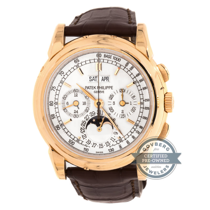 117782.57 Price:117782.57Govberg Jewelers - Since 1922Authorized dealer of the finest timepieces.Visit Our eBay StorefrontAccesoriesBaume & MercierCertified Pre-Owned WatchesClocksCollectiblesEstate JewelryJewelryJorg HysekNomos GlashutteOtherUniversal GeneveUrwerkWatchesWriting InstrumentsXemexPatek Philippe Complication Calendar 5970R-001 Manual Rose Gold Mens Strap WatchGovberg's Price: $139,500.00 Pre-Owned Patek Philippe Grand Complication Perpetual Calendar Chronograph (5970R001) manual-wind watch, features a 40mm 18k rose gold case surrounding a silver dial on a brand new brown crocodile strap with an 18k rose gold deployment buckle. Functions include hours, minutes, small-seconds, day, date, month, perpetual calendar, moon phase and chronograph. This watch comes with an extra case back, and complete with box and papers. We back this watch with a 15-month warranty! Watch this ItemSend to FriendAdditional Information:About UsShippingWarrantyReturns With one of the largest selections of prestigious timepieces, watch winders and exquisite jewelry in the country, Govberg Jewelers has been Philadelphia's premier jeweler since 1922. As an authorized retailer of over 50 brands, Govberg Jewelers sells only AUTHENTIC and NEW watches straight from the manufacturer. All of our watches come complete with box and paperwork intact. As a new member of the eBay community, we are committed to servicing all of your wristwatch needs and providing you with an enjoyable online experience. Please contact us at 800-528-8463. We look forward to hearing from you! Domestic Orders: FREE and fully insured FedEx 2nd Day shipping. Please contact us, prior to purchasing, if you require immediate shipping. We charge a flat rate of 30.00 USD for FedEx Standard Overnight. For PayPal purchases, as per PayPal requirements, we can only ship your order to the address approved by PayPal. For your security, all orders are shipped with a signature ?required. Please be sure an adult, who is authorized to ?sign for your package, will be available at the designated shipping address. For APO & FPO Orders, we DO ship to APOs or FPOs. For P.O. Boxes, we typically do not ship to P.O. Boxes. Please contact us before bidding if you fall into these categories so we may best accommodate you. International Orders: For orders over 500.00 USD, we charge a flat rate of 75.00 USD to ship FedEx Priority International. For orders under 500.00 USD, shipping is based on the value of the item and the designated shipping address. Please contact us before bidding/buying/ordering to make sure we ship to your country. We do NOT ship to Russia. Additional costs, such as customs, import duties, VAT, taxes and charges are NOT included in the item price or the shipping costs. These charges are the buyer's responsibility. Please check with your country's customs office to determine what these additional costs will be prior to bidding/buying/ordering. Please be aware that we MUST declare the amount that you paid for your watch on the international invoice included with the shipment. We cannot declare the watch as a gift/used/or at a lower value. For PayPal purchases, as per PayPal requirements we can only ship your order to the address approved by PayPal. Taxes: All items shipped within Pennsylvania will be charged 8.0% sales tax. Sales tax is NOT applicable on orders shipped anywhere outside of Pennsylvania. As an authorized dealer, all of our NEW watches come with legitimate and valid warranties from the manufacturer. Warranty coverage may differ among brands. Please contact us if you have any questions regarding the warranty information on a particular watch. Certified Previously Owned Watches: Your "Certified Previously Owned Watch" is guaranteed by Govberg Jewelers. As such, your watch is warranted against mechanical failure for 15 months from the date of purchase. Please be aware that if the wristwatch is still covered under the watch brand's international warranty, the Govberg Jewelers warranty will still be in effect. When the brand's international warranty ends, the Govberg Jewelers warranty will continue until a total of 15 months have been reached. If the Govberg warranty ends before the international warranty of the wristwatch, the watch will be warranted until the date listed on the brand's warranty card. Crystals, bracelets, straps, and cases damaged in the normal course of use will not be warranted. The original watch box, warranty, and all appropriate manuals are included unless otherwise noted in the auction. All timepieces purchased from Govberg Jewelers (exceptions apply, see below.) may be returned or exchanged within 14-days of purchase. All watches must be in their original, unused condition for a full refund of the purchase price (minus our actual shipping costs) or store credit for an exchange. When your timepiece arrives, make sure to inspect the watch before wearing or removing any tags or factory tape. Check over the watch to see that it is in perfect working order, with no blemishes. Once the watch is worn or sized (and even if it is unworn but the plastics/tags have been removed) we cannot accept a return of the watch. If, after wearing or sizing your watch, you notice that there is a mechanical problem, we will ALWAYS repair it under warranty. As an authorized dealer, our new watches come with legitimate and valid warranties from the manufacturer. We back our preowned watches with a 15-month warranty against any mechanical flaw. We will NOT replace or refund a watch once it has been worn (or the plastics/tags have been removed). It is the buyer's responsibility to inspect the watch upon receipt to ensure that it is in perfect working order, before wearing. Please Note: Please contact us prior to your return. We do NOT pay for return shipping. The order must be returned within 14-days of the date of delivery. If the watch is a gift and you are in need of an extension, please contact us prior to purchasing. Returns will be 