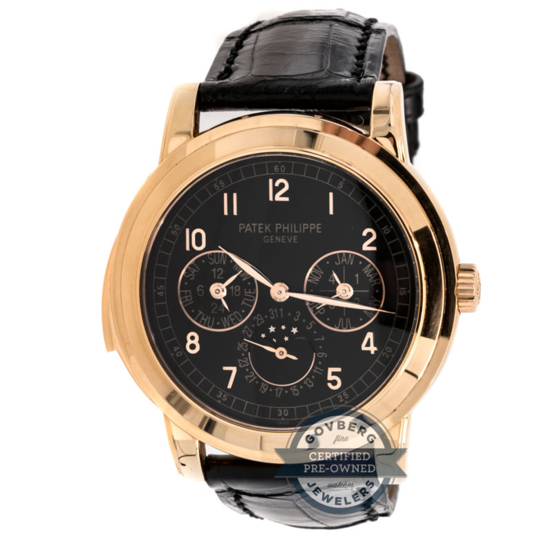525000.00 Price:525000.00Govberg Jewelers - Since 1922Authorized dealer of the finest timepieces.Visit Our eBay StorefrontAccesoriesArnold & SonBaume & MercierCertified Pre-Owned WatchesClocksCollectiblesEstate JewelryGiuliano MazzuoliJekyll and HydeJewelryJorg GrayJorg HysekLouis ErardNomos GlashutteOtherUniversal GeneveUrwerkViscontiWatchesWriting InstrumentsXemexPatek Philippe Complication Repeater Calendar 5074R-001 Auto Gold Mens WatchGovberg's Price: $525,000.00 Pre-Owned Patek Philippe Grand Complication Minute Repeater Perpetual Calendar (5074R001) self-winding automatic watch, features a 39mm 18k rose gold case surrounding a black arabic dial on a black alligator strap with an 18k rose gold tang buckle. Functions include hours, minutes, seconds, day, date, month, moon phase, perpetual calendar and minute repeater. This watch comes with a pusher, an extra solid case back and complete with box and papers. We back this watch with a 15-month warranty! Watch this ItemSend to FriendAdditional Information:About UsShippingWarrantyReturns With one of the largest selections of prestigious timepieces, watch winders and exquisite jewelry in the country, Govberg Jewelers has been Philadelphia's premier jeweler since 1922. As an authorized retailer of over 50 brands, Govberg Jewelers sells only AUTHENTIC and NEW watches straight from the manufacturer. All of our watches come complete with box and paperwork intact. As a new member of the eBay community, we are committed to servicing all of your wristwatch needs and providing you with an enjoyable online experience. Please contact us at 800-528-8463. We look forward to hearing from you! Domestic Orders: FREE and fully insured FedEx 2nd Day shipping. Please contact us, prior to purchasing, if you require immediate shipping. We charge a flat rate of 30.00 USD for FedEx Standard Overnight. For PayPal purchases, as per PayPal requirements, we can only ship your order to the address approved by PayPal. For your security, all orders are shipped with a signature ?required. Please be sure an adult, who is authorized to ?sign for your package, will be available at the designated shipping address. For APO & FPO Orders, we DO ship to APOs or FPOs. For P.O. Boxes, we typically do not ship to P.O. Boxes. Please contact us before bidding if you fall into these categories so we may best accommodate you. International Orders: For orders over 500.00 USD, we charge a flat rate of 75.00 USD to ship FedEx Priority International. For orders under 500.00 USD, shipping is based on the value of the item and the designated shipping address. Please contact us before bidding/buying/ordering to make sure we ship to your country. We do NOT ship to Russia. Additional costs, such as customs, import duties, VAT, taxes and charges are NOT included in the item price or the shipping costs. These charges are the buyer's responsibility. Please check with your country's customs office to determine what these additional costs will be prior to bidding/buying/ordering. Please be aware that we MUST declare the amount that you paid for your watch on the international invoice included with the shipment. We cannot declare the watch as a gift/used/or at a lower value. For PayPal purchases, as per PayPal requirements we can only ship your order to the address approved by PayPal. Taxes: All items shipped within Pennsylvania will be charged 8.0% sales tax. Sales tax is NOT applicable on orders shipped anywhere outside of Pennsylvania. As an authorized dealer, all of our NEW watches come with legitimate and valid warranties from the manufacturer. Warranty coverage may differ among brands. Please contact us if you have any questions regarding the warranty information on a particular watch. Certified Previously Owned Watches: Your "Certified Previously Owned Watch" is guaranteed by Govberg Jewelers. As such, your watch is warranted against mechanical failure for 15 months from the date of purchase. Please be aware that if the wristwatch is still covered under the watch brand's international warranty, the Govberg Jewelers warranty will still be in effect. When the brand's international warranty ends, the Govberg Jewelers warranty will continue until a total of 15 months have been reached. If the Govberg warranty ends before the international warranty of the wristwatch, the watch will be warranted until the date listed on the brand's warranty card. Crystals, bracelets, straps, and cases damaged in the normal course of use will not be warranted. The original watch box, warranty, and all appropriate manuals are included unless otherwise noted in the auction. All timepieces purchased from Govberg Jewelers (exceptions apply, see below.) may be returned or exchanged within 14-days of purchase. All watches must be in their original, unused condition for a full refund of the purchase price (minus our actual shipping costs) or store credit for an exchange. When your timepiece arrives, make sure to inspect the watch before wearing or removing any tags or factory tape. Check over the watch to see that it is in perfect working order, with no blemishes. Once the watch is worn or sized (and even if it is unworn but the plastics/tags have been removed) we cannot accept a return of the watch. If, after wearing or sizing your watch, you notice that there is a mechanical problem, we will ALWAYS repair it under warranty. As an authorized dealer, our new watches come with legitimate and valid warranties from the manufacturer. We back our preowned watches with a 15-month warranty against any mechanical flaw. We will NOT replace or refund a watch once it has been worn (or the plastics/tags have been removed). It is the buyer's responsibility to inspect the watch upon receipt to ensure that it is in perfect working order, before wearing. Please Note: Please contact us prior to your return. We do NOT pay for return shipping. The order must be returned within 14-days of the date of delivery. If the watch is a gift and yo
