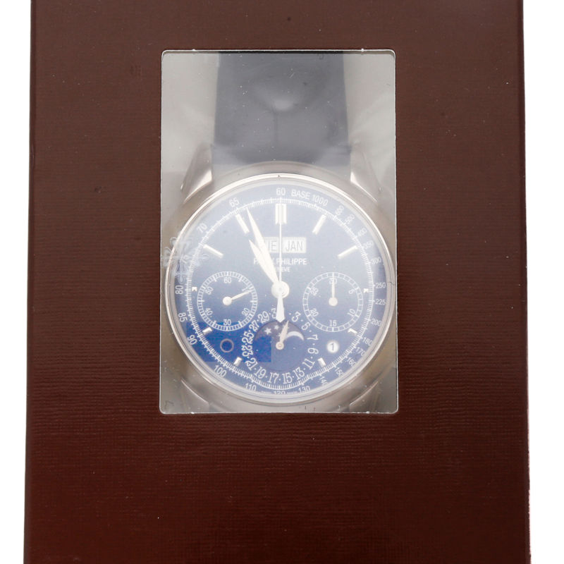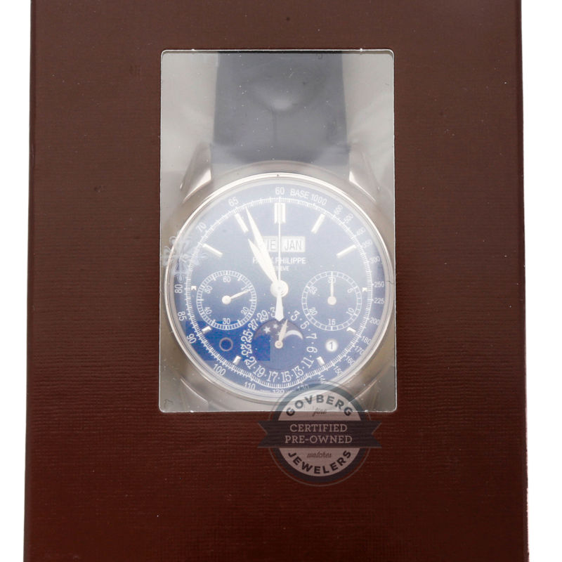 100847.64 Price:100847.64Govberg Jewelers - Since 1922 Authorized dealer of the finest timepieces. Visit Our eBay Storefront Save15% Patek Philippe Complications Calendar Chrono Manual Gold Mens Watch 5270G-014 Retail Price: $164,433.00 Govberg's Price: $139,500.00 Pre-Owned Patek Philippe Grand Complications Perpetual Calendar Chronograph (5270G014) manual-wind watch, features a 41mm 18k white gold case surrounding a blue dial with a blue alligator strap with a 18k white gold deployment buckle. Functions include hours, minutes, seconds, day, date, month, leap year indicator, day night indicator, chronograph, moon phase and perpetual calendar . This watch comes complete with box and papers. We back this watch with a 15-month warranty! Watch this Item Send to Friend Style Dress,Statement Year of Manufacture 2010 - 2017 Country/Region of Manufacture Switzerland Hour Markers Index Movement Mechanical (Hand-winding) Band Material Alligator Brand Patek Philippe Case Material White Gold Band Color Blue Age Group Adult Case Color Silver Caseback Exhibition Gender Men's Case Size 41mm Water Resistance Rating 30 m (3 ATM) Model Grand Complications Face Color Blue Display Analog Warranty 15-Month Govberg Jewelers Warranty Features n Phase,Perpetual Calendar MPN 5270G014 Watch Shape Round Box/Papers Box and Papers Increase your Sales Abroad with WebInterpret's Global Listing Solution.