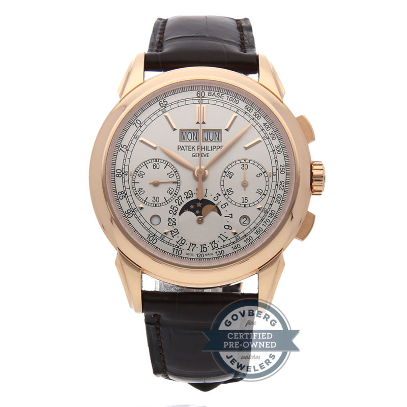 108855.07 Price:108855.07Govberg Jewelers - Since 1922 Authorized dealer of the finest timepieces. Visit Our eBay Storefront Save15% Patek Philippe Complications Calendar Chrono Manual Gold Mens Watch 5270R-001 Retail Price: $164,443.00 Govberg's Price: $139,500.00 Pre-Owned Patek Philippe Grand Complications Perpetual Calendar Chronograph (5270R001) manual-wind watch, features a 41mm 18k rose gold case surrounding a silver dial on a brown alligator strap with an 18k rose gold deployant buckle. Functions include hours, minutes, small-seconds, day, date, month, leap year indicator, day/night indicator, chronograph, tachymeter scale, moon phase and perpetual calendar. This watch has been serviced and comes complete with box and papers. We back this watch with a 15-month warranty! Watch this Item Send to Friend Style Dress Year of Manufacture 2010-2018 Buckle Type Deployant Buckle Country/Region of Manufacture Switzerland Hour Markers Index Movement Mechanical (Hand-winding) Band Material Alligator Brand Patek Philippe Case Material Rose Gold Band Color Brown Age Group Adult Case Color Rose Gold Caseback Exhibition Gender Men's UPC Does not apply Case Size 41mm Water Resistance Rating 30 m (3 ATM) Model Grand Complications Face Color Silver Display Analog Warranty 15-Month Govberg Jewelers Warranty Features l Calendar,Tachymeter MPN 5270R-001 Box/Papers Box and Papers Watch Shape Round Increase your Sales Abroad with WebInterpret's Global Listing Solution.