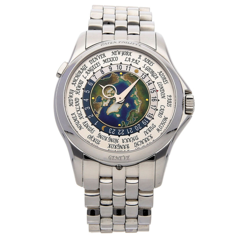 134243.79 Price:134243.79Govberg Jewelers - Since 1922 Authorized dealer of the finest timepieces. Visit Our eBay Storefront Patek Philippe Complications World Time Auto Platinum Mens Watch 5131/1P-001 Govberg's Price: $169,500.00 Pre-Owned Patek Philippe Complications World Time (51311P001) self-winding automatic watch, features a 39.5mm platinum case surrounding a cloisonne enamel dial with on a platinum bracelet with folding buckle. Functions include hours, minutes, world time and am/pm indicator. This watch comes complete with box and papers. We back this watch with a 15-month warranty! Watch this Item Send to Friend Style Dress Year of Manufacture 2010-2018 Buckle Type Folding Buckle Country/Region of Manufacture Switzerland Hour Markers None Movement Mechanical (Automatic) Band Material Platinum Brand Patek Philippe Case Material Platinum Band Color Silver Age Group Adult Case Color Silver Caseback Exhibition Gender Men's UPC Does not apply Case Size 39.5mm Water Resistance Rating 30 m (3 ATM) Model Complications Face Color Multi-Color/Misc.,Silver Display Analog Warranty 15-Month Govberg Jewelers Warranty Features GMT/World Time,Day/Night Indicator MPN 5131/1P-001 Box/Papers Box and Papers Watch Shape Round Increase your Sales Abroad with WebInterpret's Global Listing Solution.