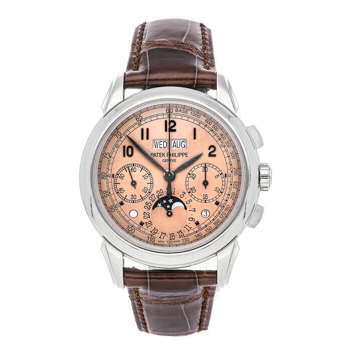 152244.22 Price:152244.22Pre-Owned Patek Philippe Grand Complications Perpetual Calendar Chronograph Mens 5270P-001 --> About the Watch Pre-Owned Patek Philippe Grand Complications Perpetual Calendar Chronograph (5270P001) manual-wind watch, features a 41mm platinum case surrounding a golden rose opaline dial on a brown alligator strap with a platinum Calatrava Cross deployant buckle. Functions include hours, minutes, small seconds, day, date, month, leap year indicator, day/night indicator, chronograph, tachymeter scale, moon phase and perpetual calendar. This watch comes complete with box and papers. Majority of Time Remaining on Factory Warranty! About the Brand Founded in 1884 by Leon Breitling, the company was conceptualized as a manufacturer of counters and chronographs for industrial and scientific purposes. In less than a decade, it became apparent that Breitling had become a “hit” because of its innovation, design, and functionality. Some of the company’s most notable clients include the American armed forces and major international airlines. --> Watch Details Reference Number5270P-001MovementMechanical (Hand-winding)Case Size41mmCase MaterialPlatinumCase ColorSilverFace ColorRoseHour MarkersDot, Arabic NumeralsDisplayAnalogWatch ShapeRoundCasebackExhibitionBand Color BrownBand MaterialAlligatorBuckle TypeDeployant BuckleGenderMen'sFeaturesetual Calendar, TachymeterBox/PapersBox and PapersWarrantyMajority of Time Remaining on Factory WarrantyCountry/Region of ManufactureSwitzerlandStyleDress, SportWater Resistance Rating30 m (3 ATM)Year of Manufacture2010-2019 About Watchbox WatchBox is the global destination for luxury pre-owned timepieces, offering an expertly curated inventory of luxury pre-owned watches for sale, personalized client services, educational opportunities and amazing video content. Shipping Information WatchBox™ can ship to most addresses in the United States and a large number of International locations (including P.O. Boxes). As per PayPal requirements, we will only ship to a confirmed PayPal shipping address, as approved by PayPal. Additional costs, such as customs, import duties, VAT, taxes and charges are the buyer's responsibility. Those charges are NOT included in the price of the item or shipping charges. Returns We offer a 30-day return window on the majority of items. Exceptions apply, see details below. All items must be returned in their original condition with the WatchBox plastic tag attached. A 10% restocking fee may be applied at the seller’s discretion, see details below. Warranty Information WatchBox offers a fifteen-month (15) limited service warranty on every product sold, unless otherwise stated. More Information Domestic Orders We offer free & fully insured FedEx 2nd-Day shipping. If you require immediate shipping, please contact us, prior to purchasing. We charge a flat rate of 30.00 USD for FedEx Standard Overnight. For security, all orders are shipped with an adult signature required. We do ship to APOs or FPOs. For P.O. Boxes, we typically do not ship to P.O. Boxes. Please contact us before bidding if you fall into these categories so we may best accommodate you. --> Due to the United States' Supreme Court ruling in South Dakota v. Wayfair, Inc., 585 U.S. ___ (2018), all sales may be subject to Sales Tax based on your shipping address. Please contact us directly if you have questions regarding the tax rate in your jurisdiction. International Orders We offer fully insured shipping to a large selection of international locations. Please contact us before bidding/buying/ordering to make sure we ship to your country. See shipping exclusions for more details. We charge a flat rate of 75.00 USD to ship FedEx International Priority. Additional costs, such as customs, import duties, VAT, taxes and charges are NOT included in the item price or the shipping costs. These charges are the buyer's responsibility. If a package is returned due to a delivery refusal, buyer will be subject to a 10% restocking fee. Please be aware that we must declare the amount that you paid on the international invoice included with the shipment. We cannot declare the watch as a gift/used/or at a lower value. Warranty WatchBox offers a limited warranty on every product sold, unless otherwise stated. Pre-owned timepieces are warranted for a minimum of fifteen (15) months from the date of purchase. The Date of Purchase is defined as the date on the bill-of-sale, sales receipt, or any dated document designated by WatchBox as proof-of-purchase. Conditions apply to the WatchBox fifteen-month (15) limited service warranty. The repair warranty does not cover parts that WatchBox did not service, basic services on quartz watches, water damage, shock damage, all abuse, or any handling that exceeds the limits of a timepiece’s intended use. Consequential and incidental damages are not recoverable under this warranty. Third-party performance of service, opening of a product, or addition of parts other than strap or bracelet components will void the WatchBox fifteen-month (15) limited warranty on pre-owned watches. WatchBox will, at its sole discretion, determine the applicability of its warranty to each timepiece for which a warranty claim is lodged. The WatchBox fifteen-month (15) limited warranty is non-transferrable. Returns Items purchased from WatchBox under $20,000.00 USD may be returned or exchanged within 30-days of purchase. Items $20,000.00 USD or more may be returned or exchanged within 14-days of purchase. All items must be in their original, unused condition for a full refund of the purchase price or store credit for an exchange. Original shipping charges will not be refunded. If within the 30-day return window, the WatchBox plastic tag is removed or watch shows signs of wear, the buyer will be subject to a 10% restocking fee. Once the watch is worn or sized we cannot accept a return of the watch. Items designated as no returns are final sale and non-returna