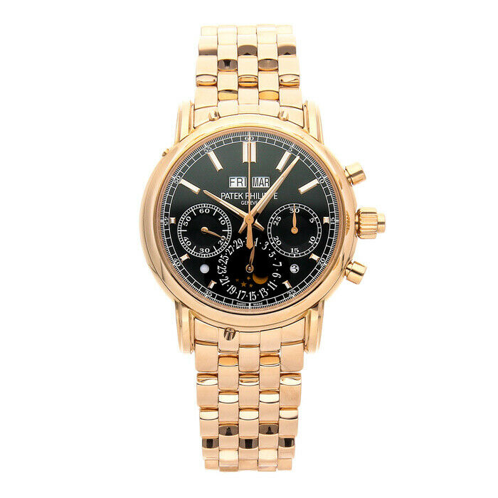 225502.53 Price:225502.53Pre-Owned Patek Philippe Grand Complications Split-Seconds Perpetual Calendar 5204/1R-001 --> About the Watch Pre-Owned Patek Philippe Grand Complications Split-Seconds Chronograph Perpetual Calendar (52041R001) manual-wind watch, features a 40.2mm 18k rose gold case surrounding a black dial on an 18k rose gold bracelet with folding buckle. Functions include hours, minutes, small-seconds, day, date, month, moon phase, leap year indicator, split second chronograph and perpetual calendar. This watch comes complete with box and papers. We back this watch with a 15-Month WatchBox warranty! About the Brand Founded in 1884 by Leon Breitling, the company was conceptualized as a manufacturer of counters and chronographs for industrial and scientific purposes. In less than a decade, it became apparent that Breitling had become a “hit” because of its innovation, design, and functionality. Some of the company’s most notable clients include the American armed forces and major international airlines. --> Watch Details Reference Number5204/1R-001MovementMechanical (Hand-winding)Case Size40.2mmCase MaterialRose GoldCase ColorRose GoldFace ColorBlackHour MarkersIndexDisplayAnalogWatch ShapeRoundCasebackExhibitionBand Color Rose GoldBand MaterialRose GoldBuckle TypeFolding BuckleGenderMen'sFeaturesl CalendarBox/PapersBox and PapersWarranty15-Month WatchBox WarrantyCountry/Region of ManufactureSwitzerlandStyleDress, SportWater Resistance Rating30 m (3 ATM)Year of Manufacture2010-2019 About Watchbox WatchBox is the global destination for luxury pre-owned timepieces, offering an expertly curated inventory of luxury pre-owned watches for sale, personalized client services, educational opportunities and amazing video content. Shipping Information WatchBox™ can ship to most addresses in the United States and a large number of International locations (including P.O. Boxes). As per PayPal requirements, we will only ship to a confirmed PayPal shipping address, as approved by PayPal. Additional costs, such as customs, import duties, VAT, taxes and charges are the buyer's responsibility. Those charges are NOT included in the price of the item or shipping charges. Returns We offer a 30-day return window on the majority of items. Exceptions apply, see details below. All items must be returned in their original condition with the WatchBox plastic tag attached. A 10% restocking fee may be applied at the seller’s discretion, see details below. Warranty Information WatchBox offers a fifteen-month (15) limited service warranty on every product sold, unless otherwise stated. More Information Domestic Orders We offer free & fully insured FedEx 2nd-Day shipping. If you require immediate shipping, please contact us, prior to purchasing. We charge a flat rate of 30.00 USD for FedEx Standard Overnight. For security, all orders are shipped with an adult signature required. We do ship to APOs or FPOs. For P.O. Boxes, we typically do not ship to P.O. Boxes. Please contact us before bidding if you fall into these categories so we may best accommodate you. --> Due to the United States' Supreme Court ruling in South Dakota v. Wayfair, Inc., 585 U.S. ___ (2018), all sales may be subject to Sales Tax based on your shipping address. Please contact us directly if you have questions regarding the tax rate in your jurisdiction. International Orders We offer fully insured shipping to a large selection of international locations. Please contact us before bidding/buying/ordering to make sure we ship to your country. See shipping exclusions for more details. We charge a flat rate of 75.00 USD to ship FedEx International Priority. Additional costs, such as customs, import duties, VAT, taxes and charges are NOT included in the item price or the shipping costs. These charges are the buyer's responsibility. If a package is returned due to a delivery refusal, buyer will be subject to a 10% restocking fee. Please be aware that we must declare the amount that you paid on the international invoice included with the shipment. We cannot declare the watch as a gift/used/or at a lower value. Warranty WatchBox offers a limited warranty on every product sold, unless otherwise stated. Pre-owned timepieces are warranted for a minimum of fifteen (15) months from the date of purchase. The Date of Purchase is defined as the date on the bill-of-sale, sales receipt, or any dated document designated by WatchBox as proof-of-purchase. Conditions apply to the WatchBox fifteen-month (15) limited service warranty. The repair warranty does not cover parts that WatchBox did not service, basic services on quartz watches, water damage, shock damage, all abuse, or any handling that exceeds the limits of a timepiece’s intended use. Consequential and incidental damages are not recoverable under this warranty. Third-party performance of service, opening of a product, or addition of parts other than strap or bracelet components will void the WatchBox fifteen-month (15) limited warranty on pre-owned watches. WatchBox will, at its sole discretion, determine the applicability of its warranty to each timepiece for which a warranty claim is lodged. The WatchBox fifteen-month (15) limited warranty is non-transferrable. Returns Items purchased from WatchBox under $20,000.00 USD may be returned or exchanged within 30-days of purchase. Items $20,000.00 USD or more may be returned or exchanged within 14-days of purchase. All items must be in their original, unused condition for a full refund of the purchase price or store credit for an exchange. Original shipping charges will not be refunded. If within the 30-day return window, the WatchBox plastic tag is removed or watch shows signs of wear, the buyer will be subject to a 10% restocking fee. Once the watch is worn or sized we cannot accept a return of the watch. Items designated as no returns are final sale and non-returnable. Payment Type PayPal Bank Wire Details Will only ship to your confirmed PayP