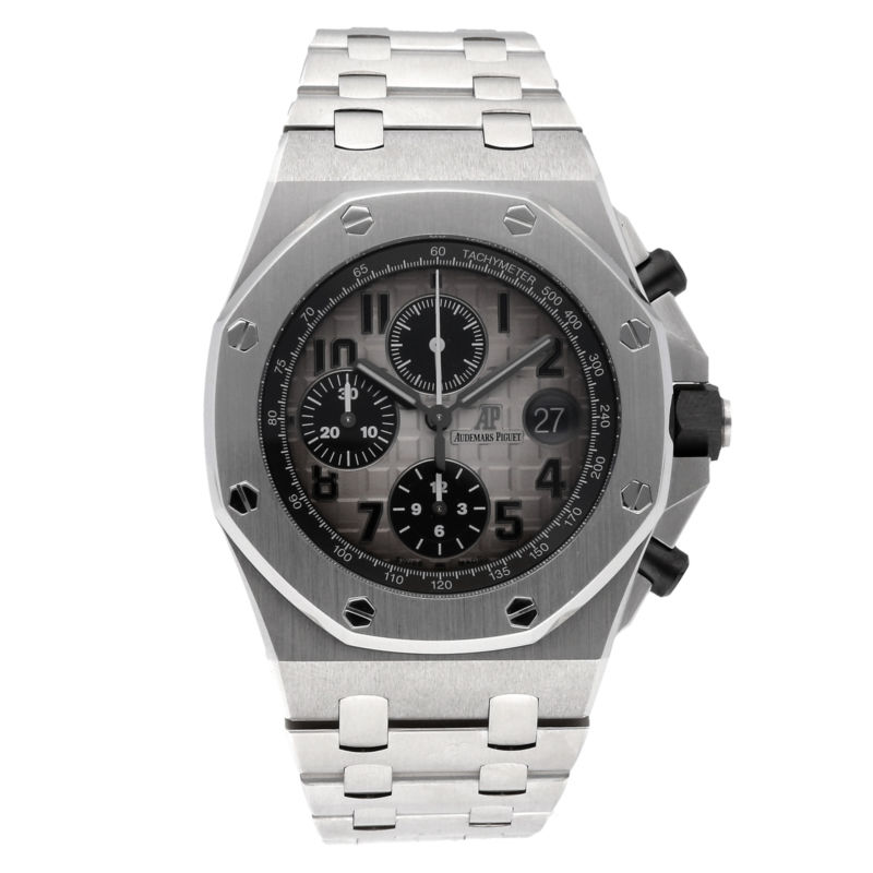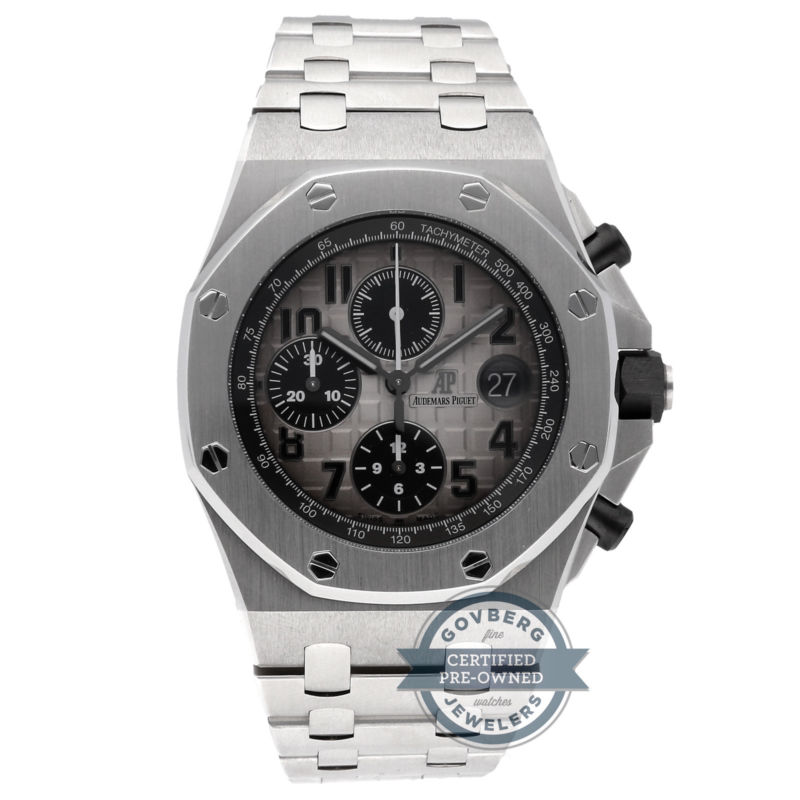 95877.66 Price:95877.66Govberg Jewelers - Since 1922 Authorized dealer of the finest timepieces. Visit Our eBay Storefront Pre-Owned Audemars Piguet Royal Oak Offshore Chronograph 26470PT.OO.1000PT.01 Govberg's Price: $129,500.00 Pre-Owned Audemars Piguet Royal Oak Offshore Chronograph (26470PTOO1000PT01) self-winding automatic watch, features a 42mm platinum case surrounding a grey mega tapisserie dial on a platinum bracelet with folding buckle. Functions include hours, minutes, small-seconds, date, chronograph and tachymeter. This watch comes complete with box and papers. J Serial. Majority of time remaining on the factory warranty! Watch this Item Send to Friend Style Casual,Dress,Sport Year of Manufacture 2010 - 2017 Buckle Type Folding Buckle Country/Region of Manufacture Switzerland Hour Markers Arabic Numerals Movement Mechanical (Automatic) Band Material Platinum Brand Audemars Piguet Case Material Platinum Band Color Silver Serial Info J Serial Age Group Adult Case Color Silver Caseback Exhibition Gender Men's UPC Does not apply Case Size 42mm Water Resistance Rating 100 m (10 ATM) Model Royal Oak Offshore Face Color Grey Display Analog Warranty Majority of Time Remaining on Factory Warranty Features Chronograph,Date Indicator,Tachymeter MPN 26470PT.OO.1000PT.01 Box/Papers Box and Papers Watch Shape Octagon Increase your Sales Abroad with WebInterpret's Global Listing Solution.