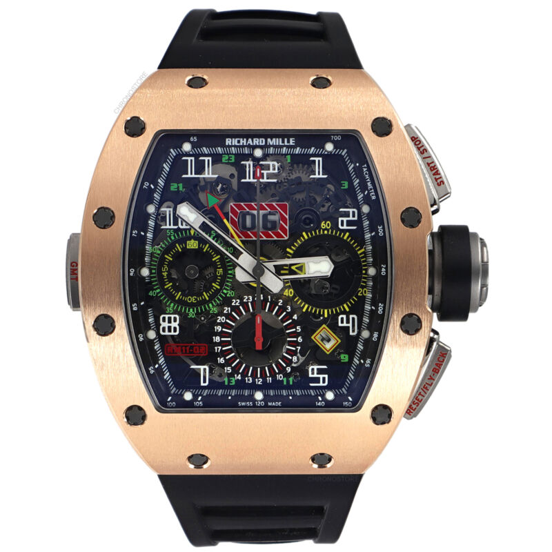 181212.03 Price:181212.03Richard Mille RM 11-02 GMT Rose Gold Titanium Rubber Automatic Mens Watch Watches Jewelry Handbags Watch parts Gifts Deals Policies Fast Delivery World Wide Shipping Authenticity Guaranteed Friendly Customer Service BRANDS: Armand Nicolet Arnold & Son Audemars Piguet Baume & Mercier Bedat & Co. Bell & Ross Blancpain Breil Breitling Bulova Burberry Bvlgari Cartier Casio Chanel Charriol Chopard Christian Dior Chronoswiss Citizen Concord Corum Cuervo Y Sobrinos David Yurman Ebel Franck Muller IWC Geneva Girard-Perreg?aux Graham Gucci Hamilton Hermes Hublot Jaeger-LeCoul?tre Jorg Hysek Longines Maurice Lacroix Marc Jacobs Michele Movado Mulco Nixon Omega Oris Other Panerai Philip Stein Rado Raymond Weil Rolex Salvatore Ferragamo Shinola Seiko TAG Heuer TechnoMari?ne Tissot Tory Burch Tudor U-Boat Ulysse Nardin Valentino Van Cleef & Arpels Versace Victorinox Swiss Army Zenith Richard Mille RM 11-02 GMT Rose Gold Titanium Rubber Automatic Mens Watch Our Price $208,599.00 Details: Brand Richard Mille Series N/A Model Number RM 11-02 Box Yes Papers Yes Production Year Warranty One Year Warranty Provided By Chronostore Movement Automatic Self Wind Gender Mens Case Material Titanium Case Shape Tonneau Case Diameter w/ crown 50mm Case Diameter 42mm Bezel Diameter 42mm Case Thickness 16mm Bezel Type Fixed Bezel Features Bezel Material Rose Gold Dial Color Skeletonized Dial Features Features Chronograph,Date,Small Seconds SubDial,Tachymeter Hour Makers Arabic Numerals Display Analog Band Color Black Band Material Rubber Band Width 26-18mm Band Features Clasp Type Deployant Clasp Material Titanium Wrist Fit 7.75 Inch Crystal Sapphire Crown Pushdown Weight in grams 161.7 Water Resistance Stock Number KFEJJJ/AH SKU Number 032860 Shipping Warranty Return Policy FAQ All in stock items are shipped within one business day. Same day shipping is available upon request. Due to insurance purposes, all packages are shipped with a tracking number and signature is required. We do not ship to PO Boxes. Import duties, taxes, and charges are not included in the item price or shipping cost. These charges are the buyer's responsibility. Please check with your country's customs office to determine what these additional costs will be, prior to bidding or buying. All watches sold by Chronostore are covered with in-house warranty for a period of 1 year after purchase for pre-owned watches and 3 years for unworn watches. Watches that lose time, gain time, do not change day or date, or have any other signs of not working properly will be serviced under our warranty program. The Chronostore warranty does not cover any damage resulting from water damage or physical harm. Additionally, the warranty does not cover polish for the watch case, any damage to crystal, band, bezel, straps, screws, crown/stem, finishes, clasps/buckles which are a result of normal wear and tear. Any lost parts of the watch, including stones, is not covered with the warranty. Any damage incurred as a result of exceeding the limitations of the watch manufacturer’s water resistance guidelines will not be covered with the warranty. Any third-party repairs, outside modifications or customizations will void the warranty. All the items purchased from Chronostore are covered with a 30-day money back guarantee. If you are not fully satisfied with your purchase, you may exchange or return your item for a refund within 30 days of first receiving your item. Item must be in the same condition as it was received, and include all original booklets, box & packaging. Any signs of wear, water damage, or altering will result in refusal of your return. Special order items, such as items we do not have in our warehouse and are specially ordered from our distributor or items that have been customized, are non-returnable. We offer free returns on eligible items, please contact us for the return shipping label. How to start an automatic watch? It’s very important to wind an automatic watch properly, prior to its use. The initial wind provided may only last a short while, making the watch appear defective once it stops ticking. To ensure your watch functions to the fullest of its capabilities, wait for it to stop and then wind the watch counter-clockwise 15-20 times. Next, push the crown back, screwing it down to preserve the water-resistance. *Be mindful that excessively winding the watch may cause damages to the movement, so don’t overdo it. Unlike self-winding watches, the crown doesn't need to be wound on quartz models. If it still isn’t ticking, simply bring it by for a battery replacement. Why the watch is running slow? A watch can lose time for various reasons including, but not limited to a dying battery, which will cause the second-hand to begin jumping across several seconds at once instead of passing each individually, magnetization, causing tension between small parts within the movement and natural friction from the watch being worn. If the watch is a mechanical model (Automatic or Manual-wind) this can also be a sign that the watch needs to be overhauled. How to use a chronograph? Operating a Chronograph requires using the pushers on the side of the case. The top pusher is used to start and stop the chronograph hand while the one at the bottom is used to reset it. Once the top pusher is pressed, the hand will run continuously, which you can track using the accompanying sub-dial. In order to reset the chronograph, it has to be stopped first. Otherwise the button will do nothing when pressed. How to set the date & time? Whether you have a screw or push-down crown, setting the date and time is simple. If its a screw-down, unscrew it by turning it downward, counterclockwise prior to following these steps. Pull out the crown to the first integer to operate the date alone, allowing the time to continue ticking. Pulling the crown out farther, you’re then allowed to adjust the time, which also shifts the date after each 24-hour cycle. On