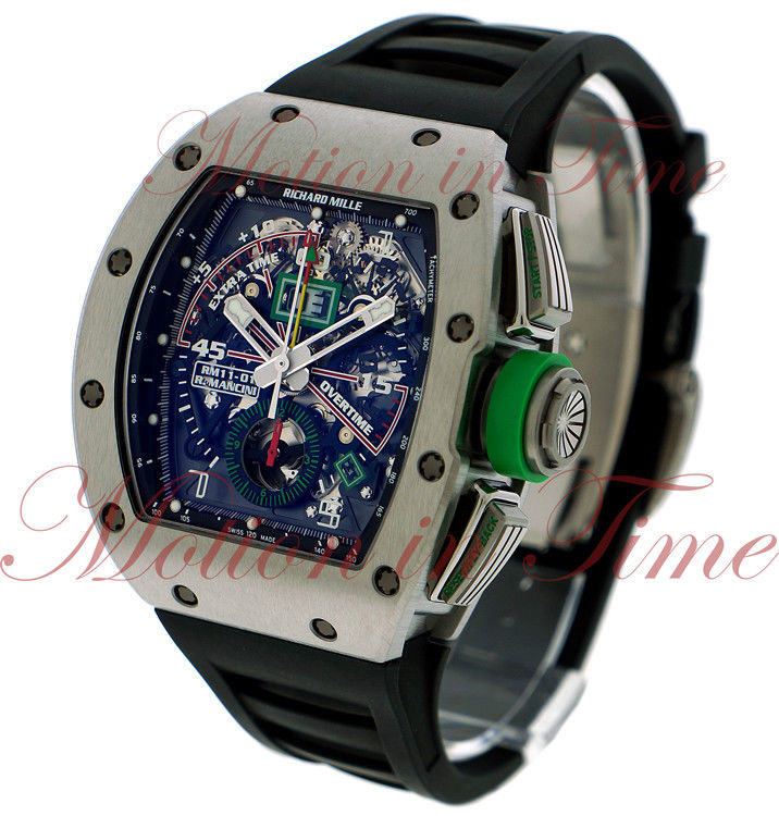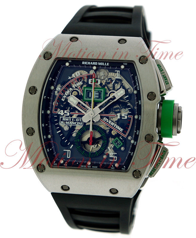 124995.00 Price:124995.00Motion in Time, Inc. Super Exclusive & Extremely Rare Richard Mille RM011-01 "Roberto Mancini" Titanium Chronograph Flyback with Annual Calendar Transparent Skeleton Dial 50mm x 42.7mm Special Edition Unworn - Complete with Box & Papers * * You WILL NOT See Many of These Around! * * EXCLUSIVE MANUFACTURED TIMEPIECES Reference No. RM011-01 BUY IT NOW FOR $124,995 OR MAKE AN OFFER!! Watch Description Exotic - Rare - And Absolutely Breathtaking! Super Exclusive RM011 From Richard Mille A powerful & striking watch - will definitely draw attention & makes for a great conversation piece. This watch features: The Richard Mille brand offers watches of the highest quality matched with incredible style. We are proud to offer one of the rarest and most collectible Richard Mille watches currently available today! Richard Millr RM011-01 Roberto Mancini Titanium, Transparent Skeleton Dial, Annual Calendar Chronograph Flyback, Movement features Rotor with Variable Geometry, Double Barrel System featuring Free Strung Balance with Variable Inertia, Black Rubber Vented Strap, Fold-Over Deployant Buckle, 50mm x 42.70mm x 16.15mm The former footballer Roberto Mancini has an impressive list of titles to his credit. As a player, he won the Italian championships six times, was voted Player of the Year in the Italian league twice, was twice part of the winning European Cup Winners’ Cup team and also lifted the UEFA Super Cup. Given this exceptional career, it was only natural for Roberto Mancini to turn manager and, in 2009, he took the mighty Manchester City team under his wing, guiding them to victory in this year’s Premier League. Roberto Mancini’s personality won Richard Mille over immediately: an unrivalled tactician, he shines with his inventiveness and elegance on the pitch. A true gentleman of football, he is the very image of the brand: refined, technically brilliant and creative. The RM 11-01 was designed especially for this new Richard Mille partner. The case is distinguished by the subtle elegance of its lines, by the curve of its middle section, and by its discreet lugs featuring a delicate shape that accentuates the timeless model. During a football match, both halves, extra time and stoppage time are all nerve-wracking periods for a manager. Tactics are decided according to the remaining match time, and strategies can lead to either victory or defeat. Roberto Mancini was looking for an ultra-technical instrument to assist him not only during matches, but especially during extra time, when the remaining minutes are no longer displayed to the players or their manager. It is a moment of intense anxiety for the latter, who no longer has any match-specific temporal reference points. Richard Mille chose to collaborate with Roberto Mancini on the creation of the RM 11-01. Equipped with the caliber RMAC1, this timepiece offers an annual calendar, a flyback chronograph with central minutes counter and a dial divided into periods of play. Although its operation appears extremely simple, in reality it is unique in watchmaking. The dial displays match time on the basis of two 45-minute halves and up to 15 minutes of stoppage time. Pressing the pusher at 4 o’clock once actuates the flyback function and repositions the hand at 12 o’clock, ready to start the second half. If extra time is awarded, the flyback function can be reactuated so that the watch shows the 15 minutes of extra match time and up to 5 minutes of stoppage time. The case of the RM 11-01 reproduces the celebrated design of the RM 011. It is tonneau shaped and made in three parts from grade 5 titanium, 18kt rose gold, and has Nitril O-ring seals that make it water-resistant to 50 meters. It is assembled using 20 spline screws, also in grade 5 titanium, and with wear-resistant 316L steel washers. Completing this extremely ergonomic case required 420 hours of design work and over 200 machining operations. Technical Specifications: Caliber RMAC1 : automatic winding movement with hours, minutes, seconds, flyback chronograph, central minutes counter, 12-hour totalizer, annual calendar and adjustable rotor geometry. Dimensions : 50.00 x 42.70 x 16.15 mm. Main Features: Power reserve: Circa 50 hours (±10%). Actual power reserve results will depend on the period of time the chronograph is utilized. Baseplate and bridges made of grade 5 titanium The manufacture of these components in grade 5 titanium with black PVD coating allows the whole assembly to be given great rigidity, as well as precise surface flatness which is essential for the perfect functioning of the gear train. Flyback chronograph: By using the pusher between 4 and 5 o’clock, the running chronograph can be reset without first having to stop the mechanism. The flyback chronograph equipping the RM 11-01 Mancini was designed for a football match. The dial displays match time based on each 45-minute half and can take up to 15 minutes of stoppage time into account. During each half, a single press on the push-piece at 4 o’clock activates the flyback function and sends the hand back to 12 o’clock, ready to start timing the second half. If extra time is awarded, the watch displays an additional 15 minutes and up to 5 minutes of stoppage time. Running operation: the user can start or stop the chronograph function via the pusher located between 1 and 2 o’clock. The Flyback Function can be continuously reset at will by depressing the second pusher located between 4 and 5 o’clock. Oversize date display: Semi-instantaneous, placed in a green outlined horizontal aperture under 12 o’clock with automatic adjustment for months of 30 or 31 days. Month display: Semi-instantaneous indicate with Arabic numerals, placed between 4 and 5 o’clock. Free sprung balance with variable inertia This type of balance wheel represents the ultimate in innovation. It guarantees greater reliability when subjected to shock and also during movement assembly and disassembly, hen