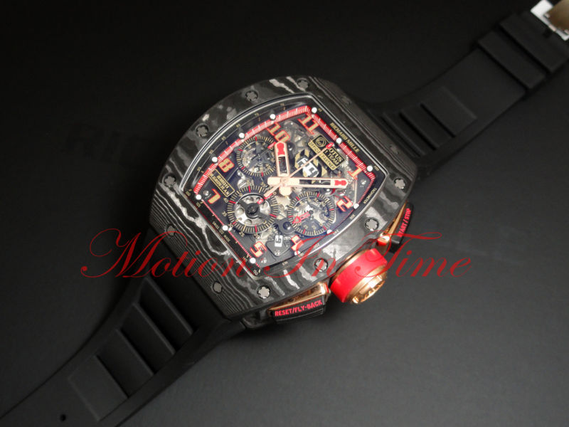 149995.00 Price:149995.00Motion in Time, Inc. Super Exclusive & Extremely Rare Richard Mille RM11 Romain Grosjean's NTPT Carbon Lotus F1 Team Skeleton Dial Chronograph Black Rubber Strap * * You WILL NOT See Many of These Around! * * Unworn - Complete with Box & Papers RETAILS FOR $160,000 BUY IT NOW FOR $149,995 OR MAKE AN OFFER!! Watch Description -- Rare Model -- Exotic - Rare - And Absolutely Breathtaking! Super Exclusive Rm11 Lotus F1 from Richard Mille . A powerful & striking watch - will definitely draw attention & makes for a great conversation piece. This watch features: Romain Grosjean Romain Grosjean, official driver in the Lotus team, follows in the footsteps of Felipe Massa and Sébastien Loeb in joining the Jura watchmaker’s group of test drivers. This elegant and unassuming true gentleman is also a front-ranking driver who has quickly made his name in motorsports: champion in the F3 Euroseries in 2007 at just 21 years old, the following year winning the first edition of the GP2 Asia Series championship before triumphing once again in the GP2 Asia Series and the GP2 Series in 2011. It is no doubt for his determination, capacity for technical analysis and his intense will to win that this outstanding racetrack performer was Romain Grosjean is testing the new, light and ultra strong RM 011 in NTPT® throughout the 2014 Grand Prix season and the latest information is that he will be wearing his watch outside his overalls, where it will be subjected to knocks, vibrations and weather conditions. The strap, too, will have to be strong enough to resist being torn off at the high speeds imposed by this sport. This strap will be mounted on the NTPT® carbon watch case of the new RM 011 Lotus F1 Team-Romain Grosjean, an automatic flyback chronograph movement in the colors of the British racing team. Brand Name: Richard Mille Style Number: RM011-NTPT-Lotus-F1-Team Also Called: RM 011 NTPT Lotus F1 Team, Romain Grosjean’s Series: RM 011 Romain Grosjean's Style (Gender): Mens Case Material: NTPT carbon, rose gold caseband Dial Color: Skeleton Movement: skeletonized automatic winding Functions: Hours, Minutes, Seconds, Flyback Chronograph, Annual calendar, Tachymeter scale around the dial. Crystal Material: Sapphire Crystal Case Length: 50.0 mm Case Width: 40.0 mm Case Thickness: 16.15 mm Bezel Material: NTPT carbon Bezel Function: Fixed Water Resistance: 50m / 165ft ( suitable for very light splashing; unsuitable for rain, showering, swimming or diving) Crown Material: 18K rose gold Calendar: Annual Calendar (adjusts for months with days of 30/31). Oversize Date at 12. Month at 4:30 Power Reserve: 55-hour power reserve Watch Bracelet / Strap Material: Black Rubber Watch Clasp Material: Folding deployant clasp An Exquisite Watch! PLEASE READ OUR ACCEPTED PAYMENT OPTIONS BELOW PRIOR TO BIDDING · 100% GUARANTEED AUTHENTIC WITH A 2 YEAR EXTENDED WARRANTY! PLEASE ALSO CHECK OUR OTHER ITEMS... E-Mail or Call ~ HAPPY BIDDING. Motion in Time is not affiliated with Richard Mille & is not an official Richard Mille Dealer. Motion in Time, Inc. is not affiliated with Richard Mille, or any other watch company, and is not an official Richard Mille Jeweler. Richard Mille 's warranty no longer attaches. Motion in Time, Inc. is the sole warrantor of these watches. Motion in Time, Inc. is not affiliated with any watch maker. All watches and watch items sold are preowned. We do not ship to Indonesia or Malaysia. CHECK OUR OTHER AUCTIONS FOR MORE GREAT DEALS! (SIGN UP FOR OUR WEEKLY EBAY DEALS) -------------------------------------------------------------------------- Why Buy From Us? BID WITH CONFIDENCE! * Motion in Time is a full-service watch and jewelry store located at 56 West 47 Street, New York, NY 10036 (Between 5th & 6th Avenues). * Be confident when buying from us ~ We are wholesalers of the world’s finest preowned wristwatches and sell brands ranging from Patek Philippe to Movado. * We are members of the International Watch & Jewelry Guild (IWJG) * We give an extended two-year warranty on all watches purchased. * We are located in the Heart of the New York Diamond District in Manhattan. Our main goal is a simple one: "Treat our clients as we would like to be treated ourselves" ---------------------------------------------------------------------------------- Payment Methods: Credit Cards AND PayPal: We accept Visa/MasterCard, American Express All International Buyers must inquire with us prior to bidding. If you have any questions or concerns please feel free to give us a call or eBay message us, we will be more than happy to assist you. (If paying with Credit Card, you must be within the United States and your billing and ship to address must be the same) - Photo ID is required to process payment PayPal: PayPal users must be Verified and Confirmed. Regarding PayPal Payments: We will only ship to the PayPal confirmed address. It is a requirement of PayPal in order to meet their protection policy. By adhering to their safety regulations, we are able to conduct safer business and as a result sell our items at lower prices. All items shipped within New York State will incur an 8.875% sales tax. ---------------------------------------------------------------------------------- Import duties, taxes, and charges are NOT INCLUDED in the item price or shipping charges. These charges are the buyer's responsibility. Please check with your country's customs office to determine what these additional costs will be prior to bidding / buying. These charges are normally collected by the delivering freight (shipping) company or when you pick the item up; do not confuse them for additional shipping charges. We do not mark merchandise values below value or mark items as "gifts". U.S. and International government regulations prohibit such behavior. We reserve the right to use the most secure shipping method and/or company to ship your purchase. Calculated shipping and insurance is an estimate only and may no