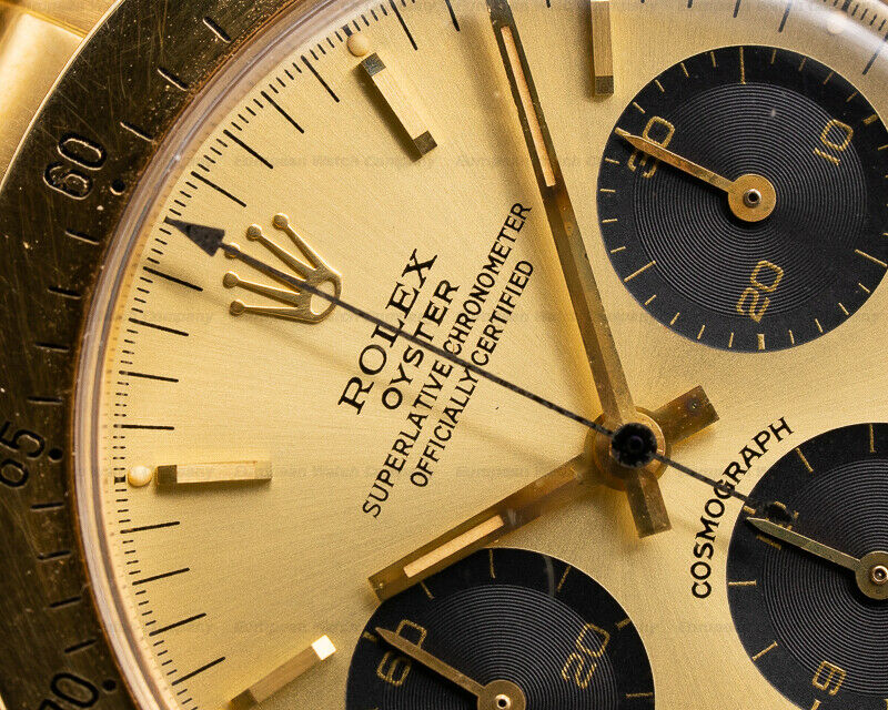 113584.81 Price:113584.81When ordering from the US, parcels may be subject to import tax and duty charges, which the buyer is responsible to pay. Home About Us Payment Shipping Returns New Arrivals Contact Us OUR BRANDS Patek Philippe Breguet Blancpain Audemars Piguet Vacheron Constantin A. Lange and Sohne Jaeger LeCoultre F. P. Journe Glashutte Original IWC Girard Perregaux Chronoswiss Ulysse Nardin Cartier Zenith Rolex Breitling Omega Baume & Mercier Other Rolex Daytona Cosmograph 18K Yellow Gold / Champagne TOP QUALITY (6265 Gold) Description Rolex 6265 Gold Daytona Cosmograph 6265, a collector quality example of a gold Rolex Daytona 6265, the 18K Yellow Gold case is in excellent condition with lugs that are full and thick and do not appear to have ever been detailed, the case has developed a warm patina as the watch appears seldom worn, original gold full length rivet bracelet with the coveted 71 end links, manual wind movement caliber 727 movement is exceptionally clean, the original champagne dial is in outstanding original condition and is near perfect, all luminous plots on the dial are present clean and fat, clean black sub dials, screw-down case back and chronograph pushers where patina is beginning to develop, acrylic crystal, original metal bezel is crisp, serial and model number are clearly visible, 595XXX serial (1980), diameter: 37mm, thickness: 13.5mm, a great statement watch and addition to your watch collection, this example is an outstanding collector cond ition for a Rolex 6265 Daytona in gold, accompanied by European Watch Company travel pouch and 6 month warranty. This is a 1980 18K yellow gold Rolex Daytona Cosmograph 6265. It has an integral 18K yellow gold Oyster link full-length rivet bracelet with 71 end links, a folding deployment clasp, and an acrylic crystal. It has screw locked round chronograph push buttons, a Twinlock screw down signed winding crown, and there is a solid screw down case back, inside of which is stamped "MONTRES ROLEX S.A. – GENEVA – SWITZERLAND – PATENTED – 6265," and hallmarks. The 37mm diameter solid three-body case, gently curved lugs, bracelet, and flat angled bezel, are brushed/polished with a warm aged patina. The original champagne sunray dial has applied faceted gold baton hour markers with luminous pips, around a perimeter black minute/chronograph second scale. It includes gold baton hands with luminous fill, a center sw eep gold needle chronograph seconds hand, and there is a black engraved tachymeter scale to 200 UPH around the bezel. It has three recessed black subsidiary dials with gold Arabic numerals, markers, and indicator hands, including a running small constant seconds register at 9 oclock, a 12-hour chronograph totalizer at 6 oclock, and there is a 30-minute chronograph totalizer at the 3 oclock position. It has a 48-hour power reserve at full winding, The 13.5mm thick case, dial, and movement are all signed. This Rolex Daytona Cosmograph 6265 has a mechanical manual winding movement Rolex caliber 727 (base Valjoux caliber 72) column wheel chronograph movement. Its rhodium plated, and its constructed with 17 jewels, an Incabloc anti-shock device, and a straight-line lever escapement. It has a Rolex Microstella adjustable-inertia balance wheel, a Breguet overcoil hairspring, a monometallic balance thats adjusted to 3 positions, and the mechanism oscillates at a frequency of 18,000 vph (2.5 Hz). The Rolex Daytona Cosmograph 6265 was introduced in 1971, and it was produced until 1988. PAYMENT SHIPPING RETURNS PAYMENT PAYMENT PayPal, Major s (phone verification required) SHIPPING SHIPPING Free USA FedEx Overnight Shipping and Insurance included. $50 USD flat rate FedEx International Priority Shipping. Please allow 1-2 day processing. RETURNS RETURNS 2-day full money back guarantee. (2 days from receiving the watch, also applies internationally) store pages Home About Us Payment Shipping Returns New Arrivals Contact Us JOIN OUR NEWSLETTER Add my Store to your Favorites and receive my email newsletters about new items and special promotions! ACCEPT PAYMENT get social Copyright © 2017, European watch. All rights reserved. Store Designed & Developed By