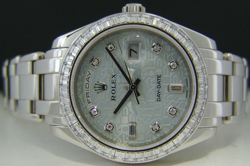 140000.00 Price:140000.00ROLEX - Platinum PearlMater MasterPiece - Glacier Diamond Jubilee Dial - 18956 Authentic Rolex ROLEX - Factory Glacier Diamond Jubilee Dial ROLEX - Men's 39mm Platinum Rolex Model 18956 ROLEX - Men's MASTERPIECE 39mm MSRP over $148,500 OUR Price: $140,000 Timepiece Details & Description Absolutely Stunning brilliant Rolex Crown Collection with the Rolex genuine Glacier Diamond Jubilee Dial! This is the 39mm Rolex Men's Platinum PearlMaster "MasterPiece" - Rolex model 18956. This is the newest style with the Rolex Platinum bracelet. To replace this Rolex has an estimated MSRP of $148,500. This Rolex is in pristine condition...Priced to sell immediately! Comes with genuine Rolex presentation boxes, Rolex books, Rolex tag, Retail Appraisal And The Sant Blanc Three Year Warranty!...In pristine condition...The Perfect Gift! This Rolex is authentic and stunning. Unconditionally guaranteed to be authentic Rolex. "Please serious bidders only". I have set the reserve well below the current value placed on this timepiece. SANT BLANC is a Swiss watch and timepiece specialist and not a Rolex dealer and have no affiliation with Rolex Watch USA. This Rolex timepiece is unconditionally guaranteed to be authentic. We are the sole warrantors of this timepiece. For questions please contact this telephone number 417-676-0322. Authentic Rolex. It does not get any better than this! Pictures do not reveal the radiant beauty of this timepiece. This Rolex is authentic and stunning. Unconditionally guaranteed to be authentic Rolex. "Please serious bidders only". I have set the reserve well below the current value placed on this timepiece. I am a Swiss Timepiece Specialist and not a Rolex dealer and have no affiliation with Rolex Watch USA. This Rolex timepiece is unconditionally guaranteed to be authentic. No factory warranty attached. We are the sole warrantors of this timepiece. For questions please contact this telephone number 417-676-0322. Payment must be received within 5 days of the end of the auction Payment Information The winning bidder must contact us within 2 days and payment must be received within 5 days of the close of this auction. If you you are unable to complete payment within 5 days, you must contact us immediately by phone 417.676.0322 or contact Contact Our Office: 417.336.9180. Guarantee This article meets or exceeds the demanding standards and specifications set by Sant Blanc. This item is authentic and genuine in pristine condition, functions properly and accurately and comes with a full seven day return money back guaranty. We are not responsible for photography and description errors and omissions in this auction. Changes and modifications to this description may be made at any time, and for any reason with out notice. This auction may be ended at anytime without notice. For questions and clarifications contact our office: 417.676.0322 contact : Contact Our Office: 417.336.9180 Warranty SANT BLANC warranty is for a full three years. The dependable operation of this article for a period of three years from the date of purchase. Modification, tampering and abuse void warranty. SANT BLANC is the sole warrantor of this article, the demanding warranty no longer apply. SANT BLANC Service & Warranty Division and The SANT BLANC Service Center, services and repairs Swiss Made watches and timepieces. The SANT BLANC Service and Warranty Division has over 30 years experience as Swiss Timepiece specialist factory trained and certified "Watchmaker". The credentials include AWCI CW21 certified as one of the world's leading watchmaker. Our watchmaker is a certified graduate watchmaker with continuing Swiss Watch education including training from the Rolex Dallas Training Facility. Sant Blanc is dedicated to setting the highest standards in Swiss Timepiece excellence. We have a complete Swiss watch service center. We do our own inhouse photography, and research. Please contact us if we can be of service to you. Shipping Information Overnight shipping is included. This item is professionally packaged and shipped fully insured, adult signature required at delivery. We ship via FedEx, UPS, Brinks, Private Courier and United States Express Mail. Items are typically shipped within two business days of receipt of payment. You will be notified when your item has been shipped. We are not responsible for shipping and/or delivery delays resulting from acts of nature, thief, strikes, or shipping company errors affecting the shipment and/or delivery. This shipment is fully insured.. We ship world-wide fully insured by: UPS, FEDEX, BRINKS, Private Courier, and United States Express Mail. ATTENTION International Customers. NOTICE: International shipments are shipped at the customers risk to shipping delays, international and national regulations, Customs fees, taxation, and damage due to and/or resulting from shipping. We are not responsible for shipping delays, damage, theft, acts of nature affecting the shipment, Customs duties, fees, taxation or regulatory import restrictions. This disclaimer applies only to shipments outside the United States, and does not apply to shipments within the United States. Arrangements must be made for delivery to PO boxes. Provide a physical address, and contact phone number with your payment. If payment is made by PayPal, and your shipping address is different than your confirmed address in PayPal, you must contact us directly to let us know of the requested change. Address change approval will be sent to you, otherwise this item will be sent to your confirmed PayPal address. About Sant Blanc SANT BLANC is a Swiss Timepiece Specialist Company, located in Branson Missouri USA. The Sant Blanc Service Center is a state of the art service facility, servicing all Swiss Made watches and is open to our customers by appointment. The Sant Blanc Sale Division specializes in offering the finest Swiss Made Timepieces. The Sant Blanc Consignment Division sells watches on