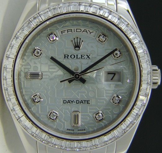 140000.00 Price:140000.00ROLEX - Platinum PearlMater MasterPiece - Glacier Diamond Jubilee Dial - 18956 Authentic Rolex ROLEX - Factory Glacier Diamond Jubilee Dial ROLEX - Men's 39mm Platinum Rolex Model 18956 ROLEX - Men's MASTERPIECE 39mm MSRP over $148,500 OUR Price: $140,000 Timepiece Details & Description Absolutely Stunning brilliant Rolex Crown Collection with the Rolex genuine Glacier Diamond Jubilee Dial! This is the 39mm Rolex Men's Platinum PearlMaster "MasterPiece" - Rolex model 18956. This is the newest style with the Rolex Platinum bracelet. To replace this Rolex has an estimated MSRP of $148,500. This Rolex is in pristine condition...Priced to sell immediately! Comes with genuine Rolex presentation boxes, Rolex books, Rolex tag, Retail Appraisal And The Sant Blanc Three Year Warranty!...In pristine condition...The Perfect Gift! This Rolex is authentic and stunning. Unconditionally guaranteed to be authentic Rolex. "Please serious bidders only". I have set the reserve well below the current value placed on this timepiece. SANT BLANC is a Swiss watch and timepiece specialist and not a Rolex dealer and have no affiliation with Rolex Watch USA. This Rolex timepiece is unconditionally guaranteed to be authentic. We are the sole warrantors of this timepiece. For questions please contact this telephone number 417-676-0322. Authentic Rolex. It does not get any better than this! Pictures do not reveal the radiant beauty of this timepiece. This Rolex is authentic and stunning. Unconditionally guaranteed to be authentic Rolex. "Please serious bidders only". I have set the reserve well below the current value placed on this timepiece. I am a Swiss Timepiece Specialist and not a Rolex dealer and have no affiliation with Rolex Watch USA. This Rolex timepiece is unconditionally guaranteed to be authentic. No factory warranty attached. We are the sole warrantors of this timepiece. For questions please contact this telephone number 417-676-0322. Payment must be received within 5 days of the end of the auction Payment Information The winning bidder must contact us within 2 days and payment must be received within 5 days of the close of this auction. If you you are unable to complete payment within 5 days, you must contact us immediately by phone 417.676.0322 or contact Contact Our Office: 417.336.9180. Guarantee This article meets or exceeds the demanding standards and specifications set by Sant Blanc. This item is authentic and genuine in pristine condition, functions properly and accurately and comes with a full seven day return money back guaranty. We are not responsible for photography and description errors and omissions in this auction. Changes and modifications to this description may be made at any time, and for any reason with out notice. This auction may be ended at anytime without notice. For questions and clarifications contact our office: 417.676.0322 contact : Contact Our Office: 417.336.9180 Warranty SANT BLANC warranty is for a full three years. The dependable operation of this article for a period of three years from the date of purchase. Modification, tampering and abuse void warranty. SANT BLANC is the sole warrantor of this article, the demanding warranty no longer apply. SANT BLANC Service & Warranty Division and The SANT BLANC Service Center, services and repairs Swiss Made watches and timepieces. The SANT BLANC Service and Warranty Division has over 30 years experience as Swiss Timepiece specialist factory trained and certified "Watchmaker". The credentials include AWCI CW21 certified as one of the world's leading watchmaker. Our watchmaker is a certified graduate watchmaker with continuing Swiss Watch education including training from the Rolex Dallas Training Facility. Sant Blanc is dedicated to setting the highest standards in Swiss Timepiece excellence. We have a complete Swiss watch service center. We do our own inhouse photography, and research. Please contact us if we can be of service to you. Shipping Information Overnight shipping is included. This item is professionally packaged and shipped fully insured, adult signature required at delivery. We ship via FedEx, UPS, Brinks, Private Courier and United States Express Mail. Items are typically shipped within two business days of receipt of payment. You will be notified when your item has been shipped. We are not responsible for shipping and/or delivery delays resulting from acts of nature, thief, strikes, or shipping company errors affecting the shipment and/or delivery. This shipment is fully insured.. We ship world-wide fully insured by: UPS, FEDEX, BRINKS, Private Courier, and United States Express Mail. ATTENTION International Customers. NOTICE: International shipments are shipped at the customers risk to shipping delays, international and national regulations, Customs fees, taxation, and damage due to and/or resulting from shipping. We are not responsible for shipping delays, damage, theft, acts of nature affecting the shipment, Customs duties, fees, taxation or regulatory import restrictions. This disclaimer applies only to shipments outside the United States, and does not apply to shipments within the United States. Arrangements must be made for delivery to PO boxes. Provide a physical address, and contact phone number with your payment. If payment is made by PayPal, and your shipping address is different than your confirmed address in PayPal, you must contact us directly to let us know of the requested change. Address change approval will be sent to you, otherwise this item will be sent to your confirmed PayPal address. About Sant Blanc SANT BLANC is a Swiss Timepiece Specialist Company, located in Branson Missouri USA. The Sant Blanc Service Center is a state of the art service facility, servicing all Swiss Made watches and is open to our customers by appointment. The Sant Blanc Sale Division specializes in offering the finest Swiss Made Timepieces. The Sant Blanc Consignment Division sells watches on